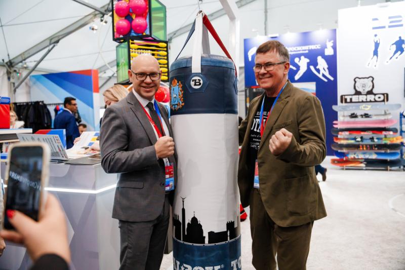 Наша компания также принимала участие в этом форуме. И хотя мы не фигурировали (пока) при подписании более 100 важных соглашений о сотрудничестве между всероссийскими спортивными федерациями, министерствами и представителями бизнеса, у TOTALBOX было (как в фильме "Кавказская пленница") одно маленькое, но очень ответственное поручение. Получив приглашение от Минпромторга РФ и Росконгресса, мы представили на их экспозиции свой уникальный продукт - особый боксерский мешок, который выполняет функции книги отзывов.